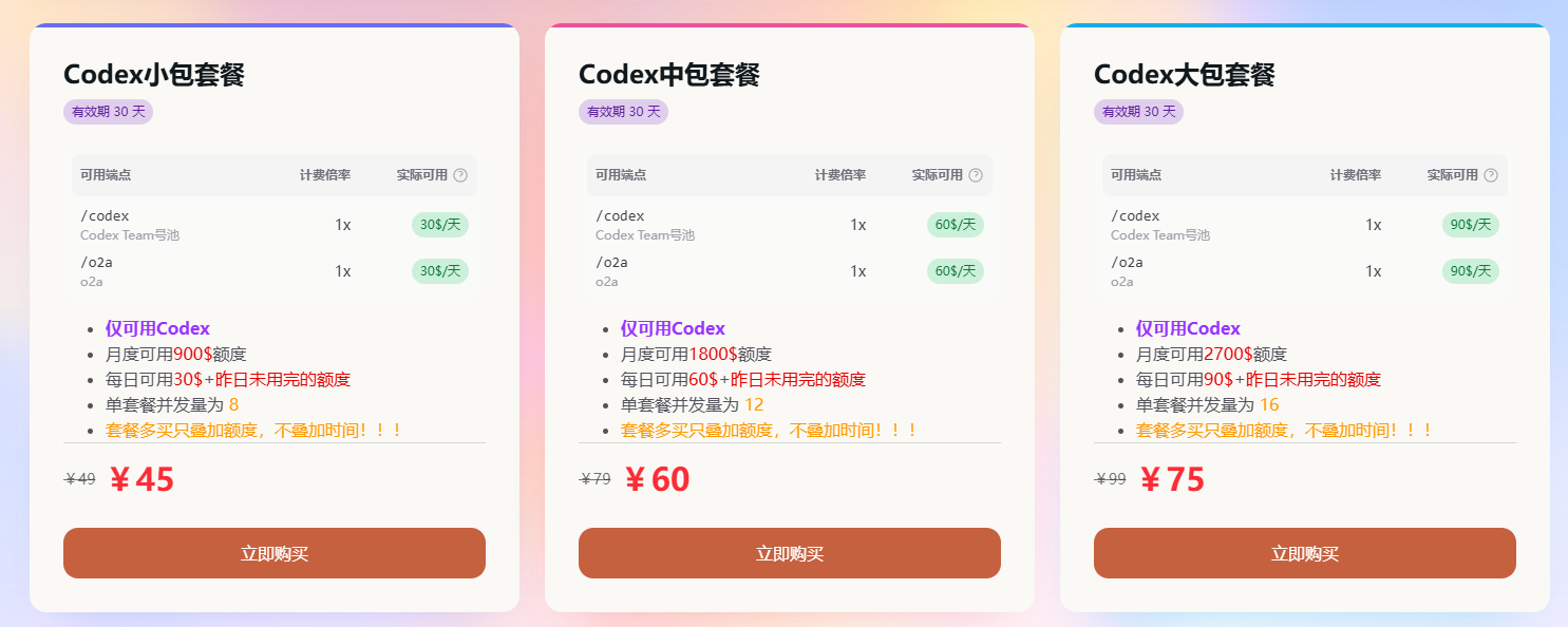 gpt通常有包月的套餐,一天能用60~120刀不等,中转站包月通常一个月不会超过80 rmb,是非常实用的大模型套餐
