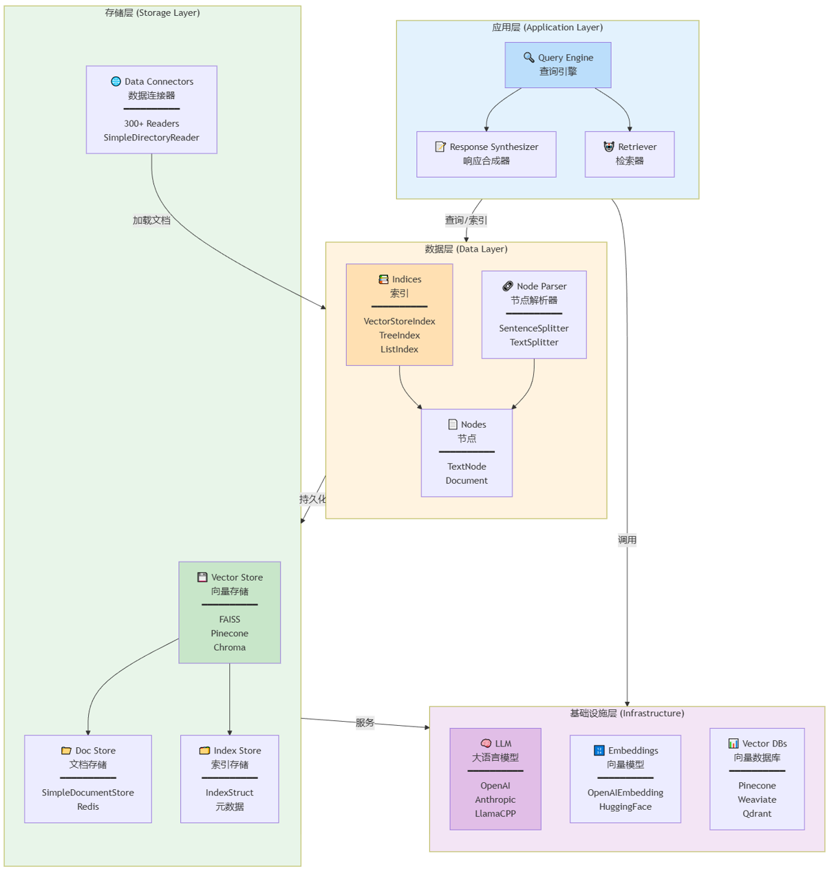 LlamaIndex 在 LLM 应用开发栈中处于框架层,介于基础模型层和应用层之间。其内置了多种RAG必须的使用的范式,如:文本切分(Chunking)、向量化(Embedding)、检索(Retrieval)和生成(Generation)。