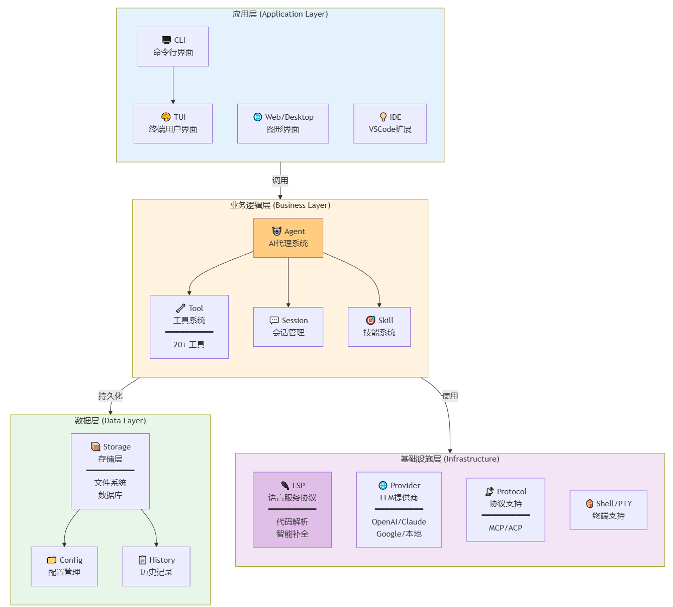 OpenCode 采用现代化的四层架构设计,实现从用户输入到 AI 响应的完整链路: